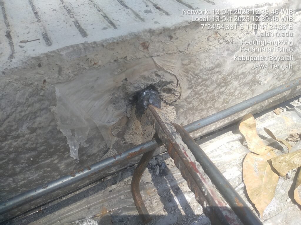 Bahkan di beberapa titik, ti’dar tampak terputus dan disambung kembali dengan cara dilas, padahal metode tersebut tidak diperbolehkan secara teknis karena dapat menurunkan kekuatan struktur beton dan mengganggu daya rekat cor.
