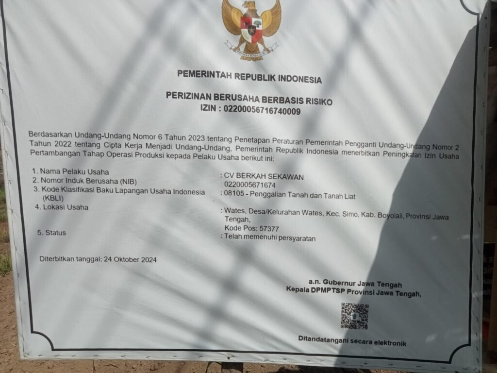 Berdasarkan papan Perizinan Berusaha Berbasis Risiko, izin usaha atas nama CV Berkah Sekawan mencantumkan lokasi usaha di Wates, Desa/Kelurahan Wates, Kecamatan Simo, Kabupaten Boyolali. Namun, dari hasil penelusuran dan keterangan warga sekitar, titik aktivitas penggalian diduga berada di luar area yang tercantum dalam dokumen perizinan.