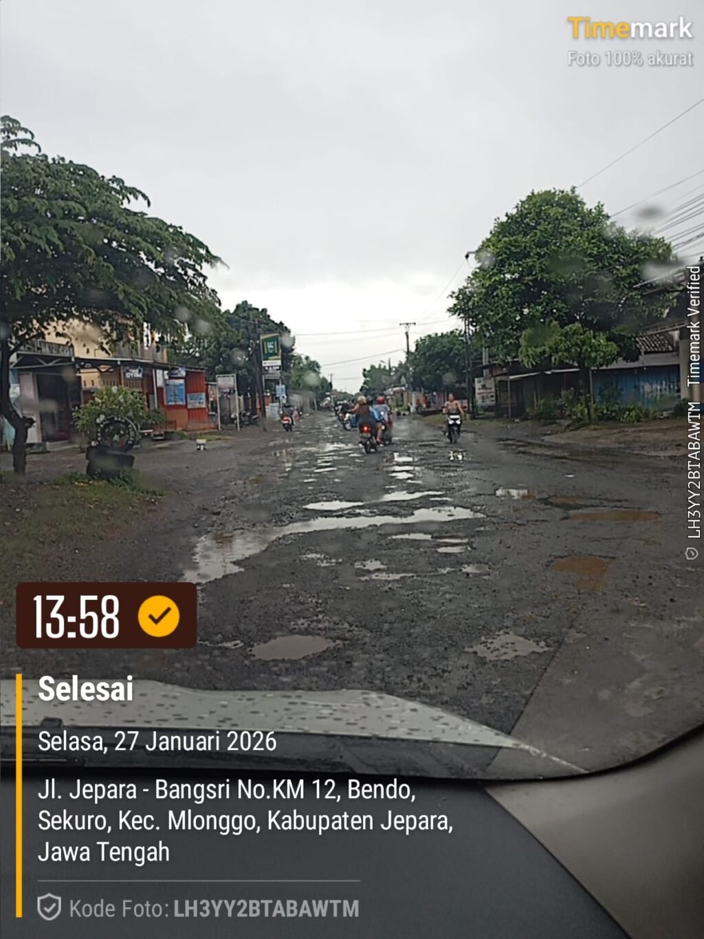 Veritas,Jepara – Ruas jalan Jepara–BangsrI KM 12 di wilayah Bendo, Desa Sekuro, Kecamatan Mlonggo, Kabupaten Jepara, berubah jadi “jebakan” bagi pengendara.